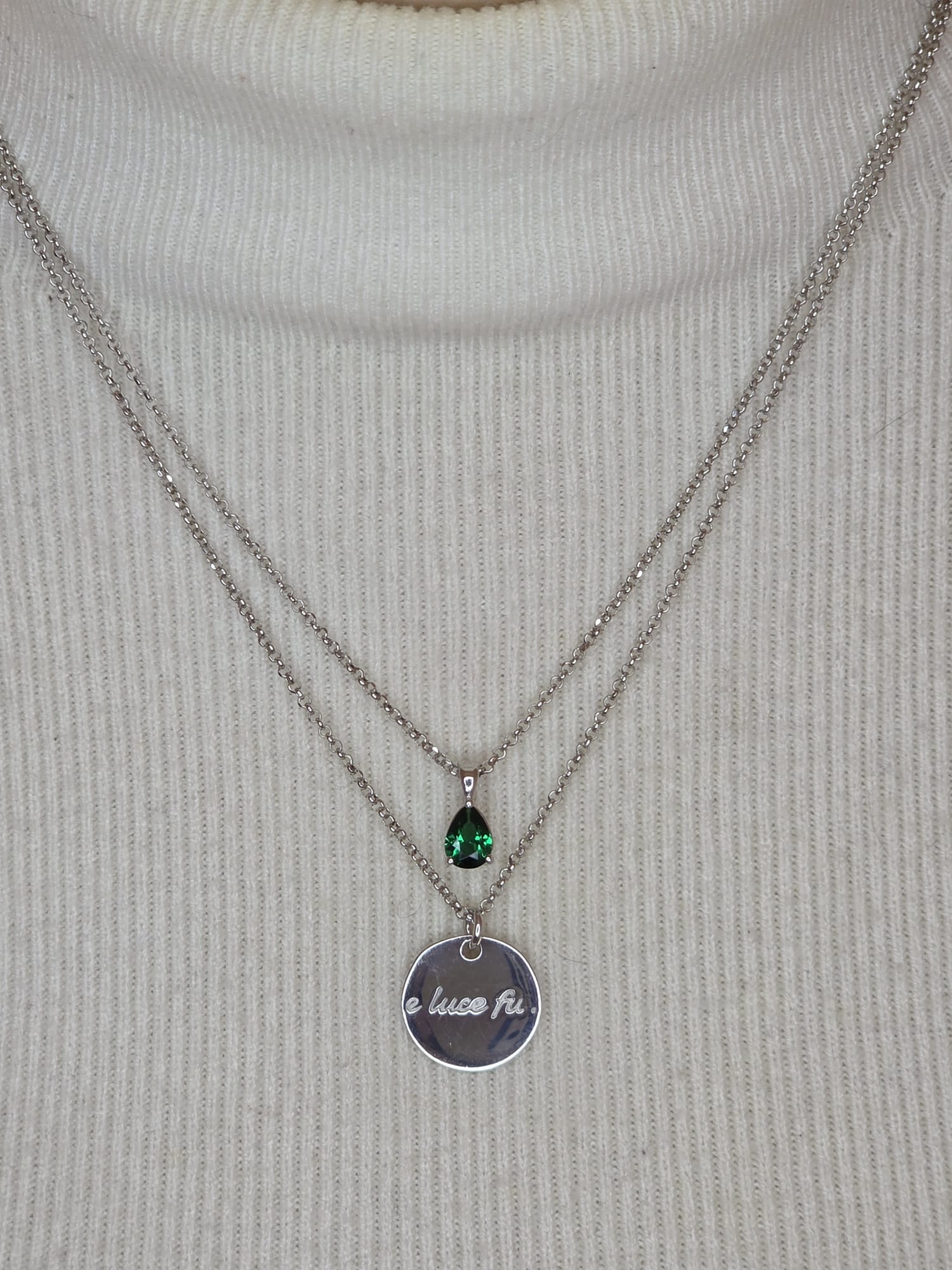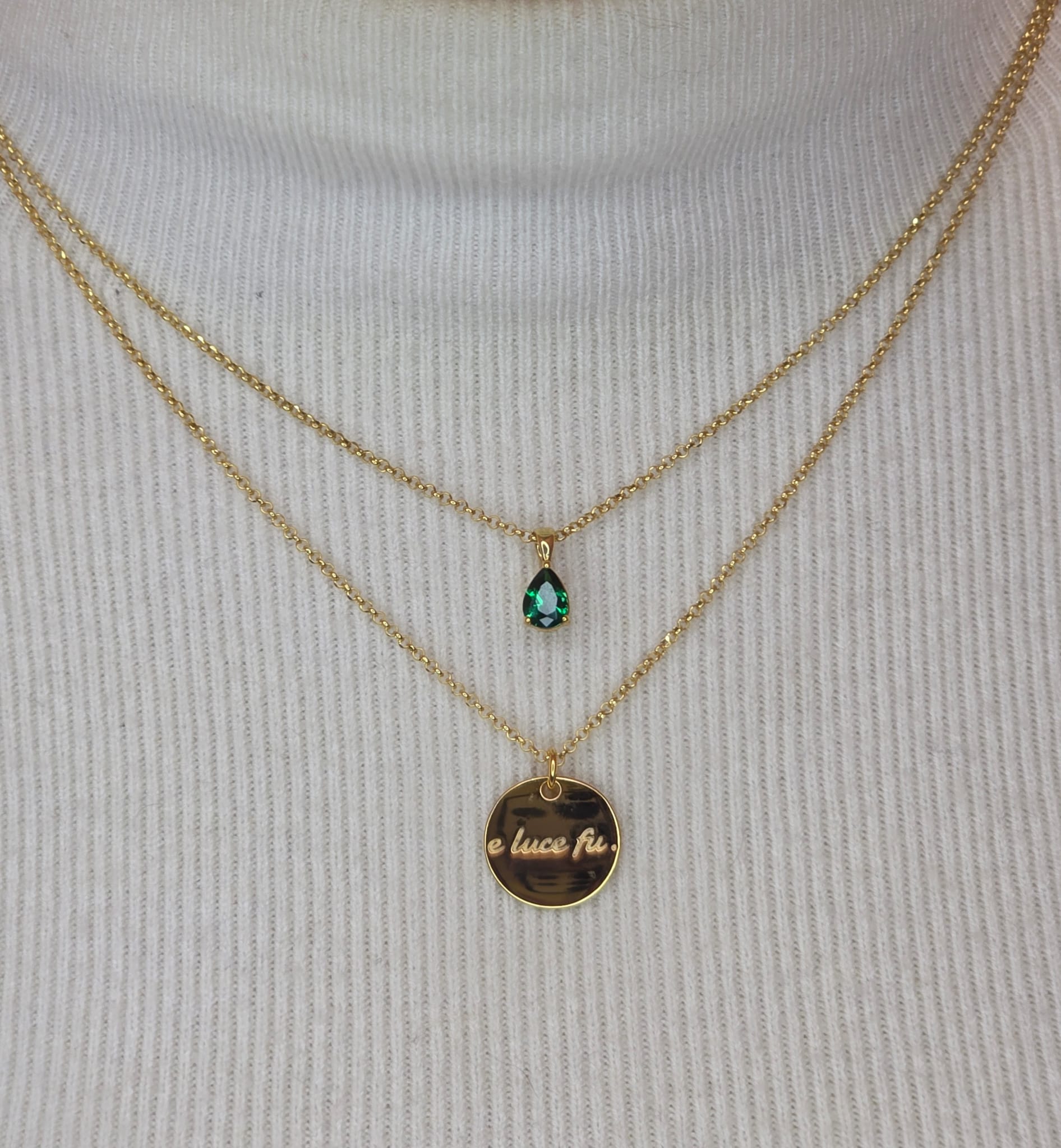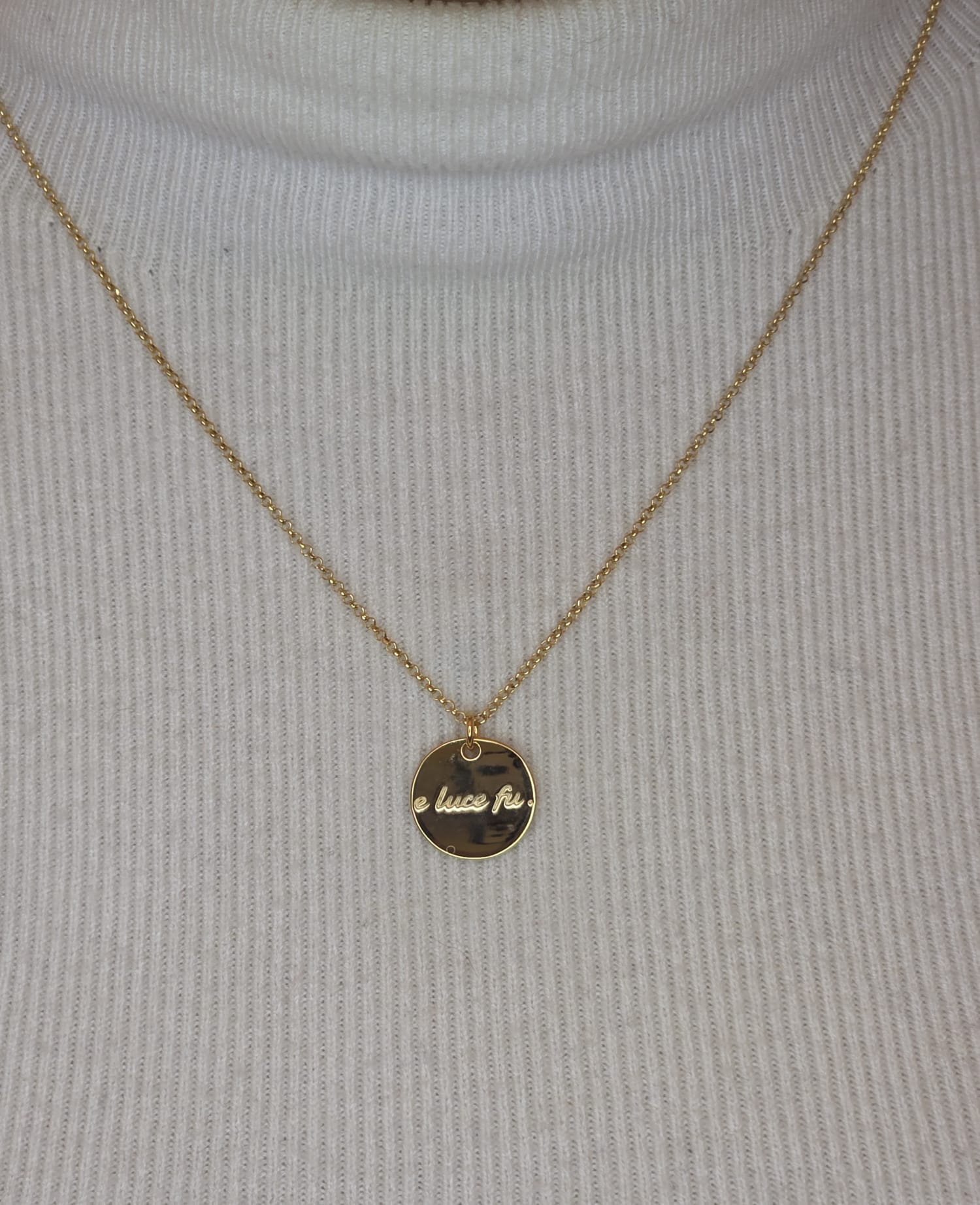 Collana catena rolò lunga 45 cm con medaglietta incisa. La medaglietta rotonda rappresenta la completezza e l'ordine ricevuto dalla Luce manifestata nel mondo. Chi porta questa collana porta con sé un messaggio di fede: la Luce già presente in ogni area della propria vita! è anche un promemoria per i momenti difficili, la Luce trionfa sempre!